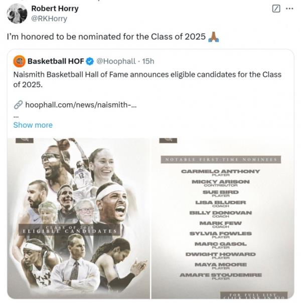其中,七冠成員羅伯特-霍里在列。對此,他轉推評論道:“我很榮幸能夠提名2025屆奈史密斯名人堂?!?/p>